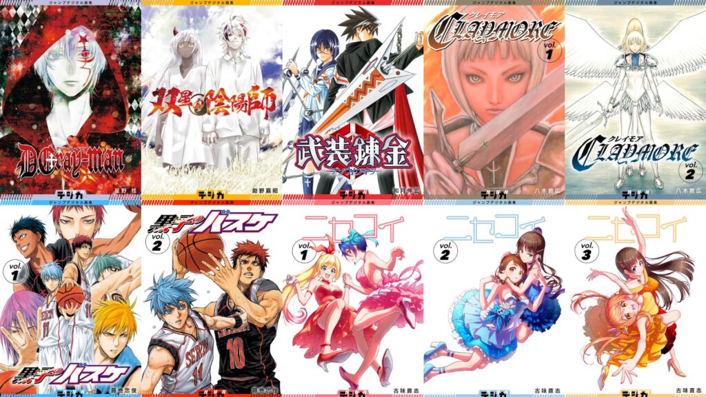 The initial lineup consists of titles from Weekly Shonen Jump and Jump Square. These are Katsura Hoshino’s D.Gray-Man, Yoshiaki Sukeno’s Twin Star Exorcists, Nobuhiro Watsuki’s Buso Renkin, Norihiro Yagi’s Claymore, Tadatoshi Fujimaki’s Kuroko’s Basketball, and Naoshi Komi’s Nisekoi