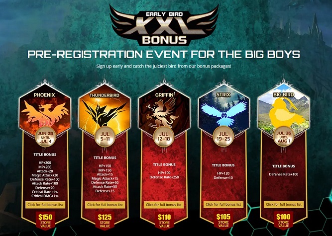 Those who pre-register early will be eligible to participate in the Early Bird Bonus XXL campaign. Players will get a redeemable code sent to the email they used for pre-registration and will grant them access to rewards which will be inserted into their accounts at the start of the Open Beta Test phase. Players will also get Titles with stat bonuses to reflect how early they signed on for the game.