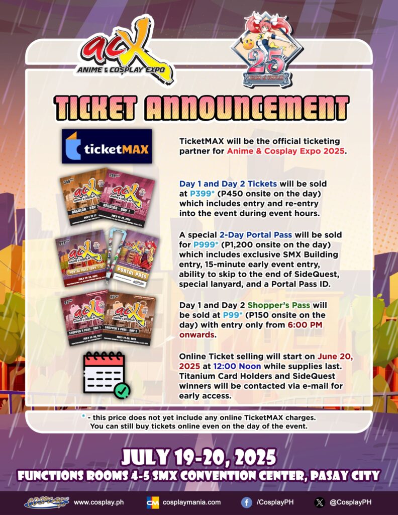 Embrace the rhythm of the rain and buy your tickets now at https://cosplayph.ticketmax.ph, starting from 99 pesos*! Make sure to follow Anime and Cosplay eXPo’’s official website and Cosplay Mania’s social media channels for more exciting updates!