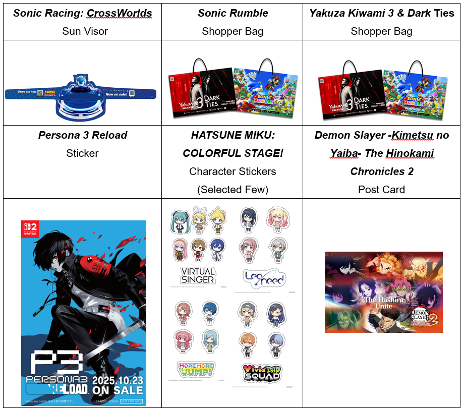 Don’t forget to stop by the merchandise area to find exclusive items from the Sonic series, Like a Dragon series, and ATLUS titles