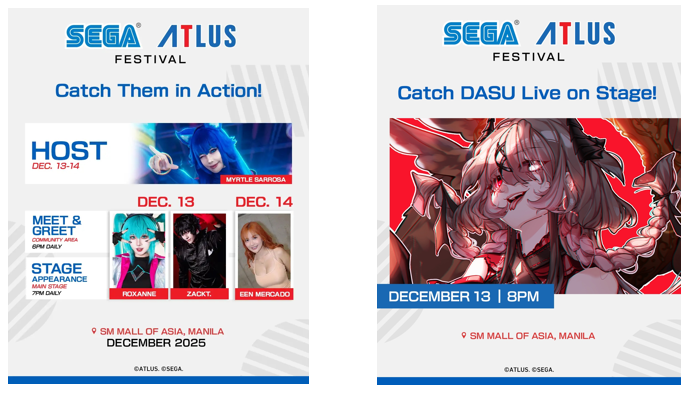 SEGA is excited to announce that the SEGA ATLUS Festival will take place in Manila on December 13 and 14 at the SM Mall of Asia. This year’s festival brings together major SEGA and ATLUS titles with a variety of exciting experiences, including hands-on gameplay, community activities, and special stage programs. Visitors can also join the stamp rally for a chance to win special prizes and shop for exclusive merchandise.