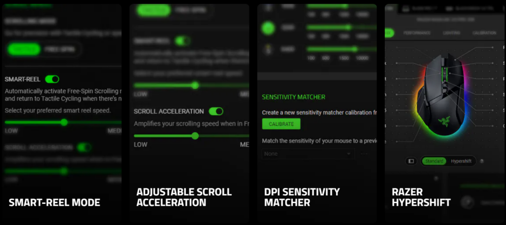 - Configurable Razer™ HyperScroll Tilt Wheel: Offers customizable scrolling experiences from smooth, free-spinning to tactile incremental movements. Users can also auto-switch between the two based on their scroll speed in Smart-Reel mode—now configurable on the new Synapse 4. In addition, gamers can layer on preferred scroll acceleration settings to amplify their virtual scrolling speed.