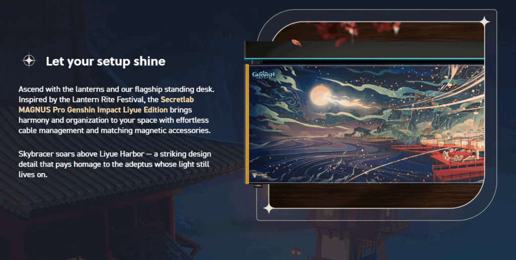 In addition to the chairs, Secretlab also unveiled the MAGNUS Pro Genshin Impact Liyue Edition, a limited-edition sit-to-stand desk celebrating the Lantern Rite Festival. Starting from US$878, the desk includes: