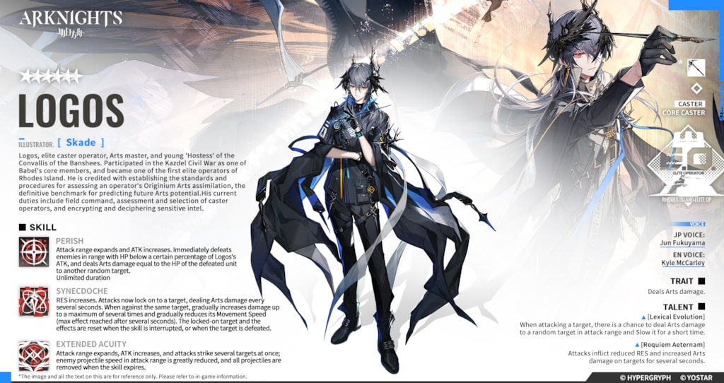 Logos deals Arts damage, and his unique talent allows him to further amplify his impact: when attacking a target, he has a chance to also strike another random target within his Attack Range, dealing Arts damage and Slowing them for a certain duration.