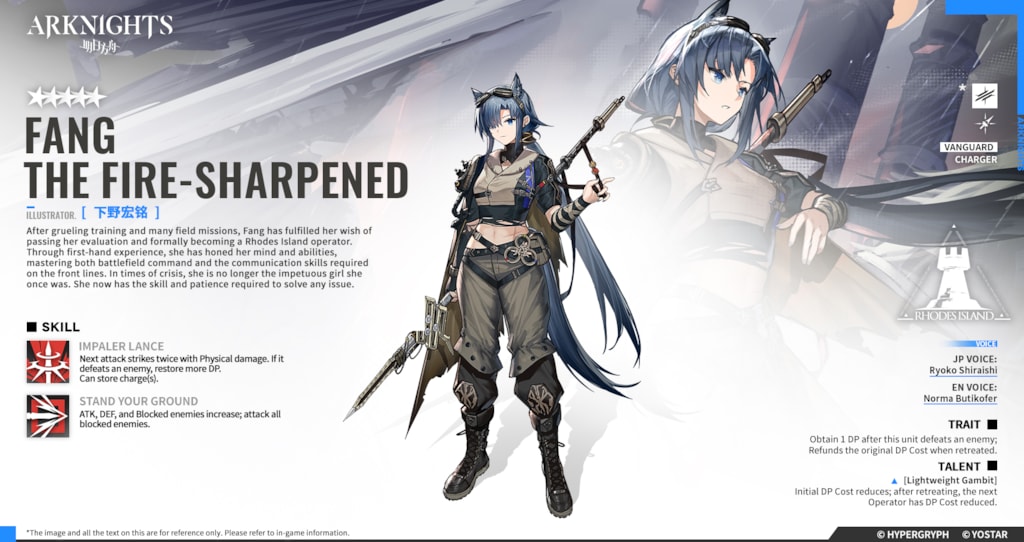 Fang the Fire-sharpened obtains 1 DP after defeating an enemy and refunds the original DP cost when retreated. Her talent reduces the DP cost of her first deployment, and upon retreat, it also reduces the DP cost of the next deployed operator.