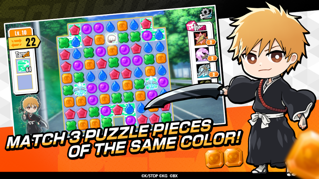 A puzzle game where players match 3 puzzle pieces of the same color. Just match puzzle pieces! It’s that simple! Feel the rush of clearing tons of puzzle pieces with items that can only be found in the world of BLEACH! Players will discover more gameplay elements as they progress, so think carefully about a strategy to clear certain puzzles!