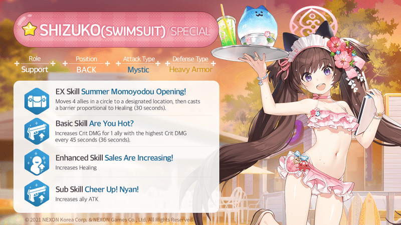 “Blue Archive” is also adding four new students. Hoshino (Swimsuit) from the Abydos Academy, available from Fest Recruitment, is an Explosive Striker whose EX skill both increases the ATK of allies within range of her and grants an Explosive Effectiveness buff. During the event, players can also recruit Shizuko (Swimsuit), a Mystic Special whose EX Skill moves four allies within a circular range to a designated location and grants them a Shield proportional to her Healing.