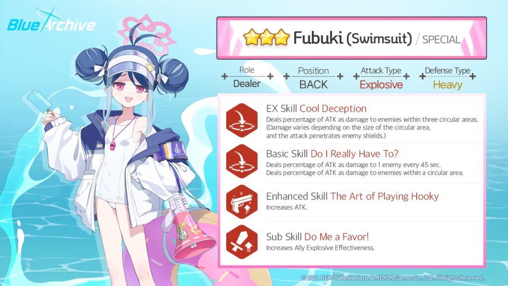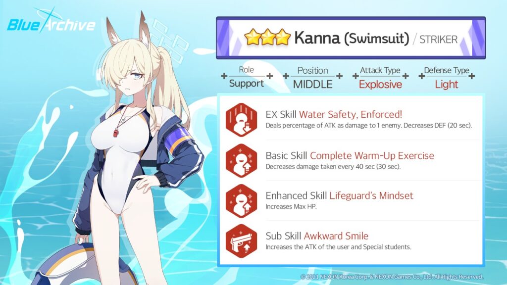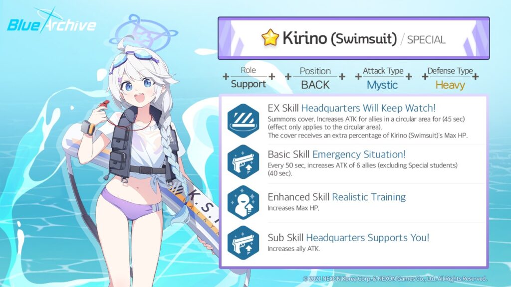 Kirino (Swimsuit) debuts as a Mystic Type support student. Her abilities include summoning a cover that enhances the attack (ATK) of allies in a circular area for 45 seconds, with additional HP based on her Max HP. Players can obtain Kirino by completing the first mission of the “Say-Bing!” event story.