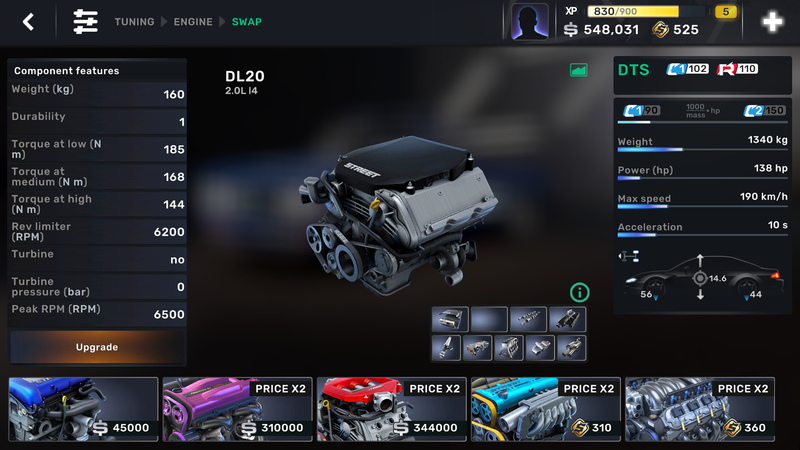 – Swap parts and trick out your car for a specific race.