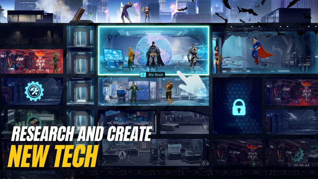 • Customize and develop your Batcave, transforming it into a formidable base with advanced technologies and training facilities.