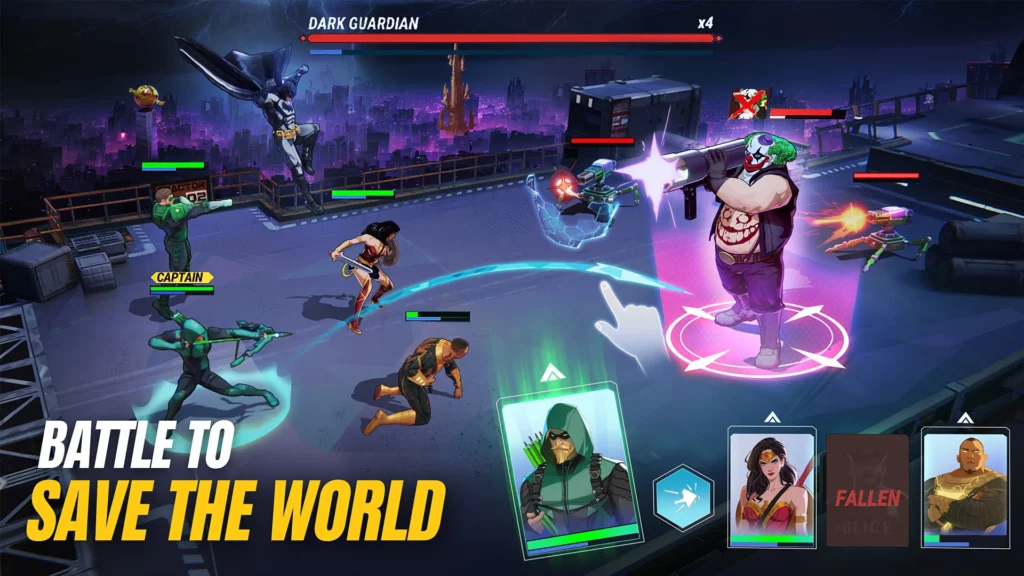 Players can assemble teams from a diverse roster of legendary characters. Superheroes from the Justice League, such as Batman, Superman, Wonder Woman, and Aquaman, are at your command. On the flip side, powerful villains like The Joker, Lex Luthor, Harley Quinn, and The Batman Who Laughs are also available, providing a rich array of strategic options. Each character can be upgraded, unlocking their unique superpowers and enhancing their combat effectiveness.