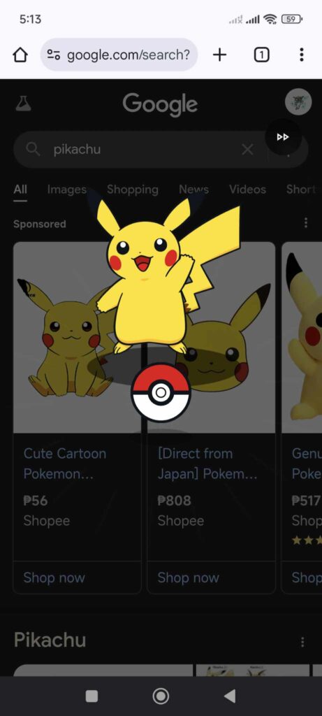 - Search for a Pokémon: Type the name of any of the original 151 Pokémon into Google Search. For example, enter “Pikachu.”