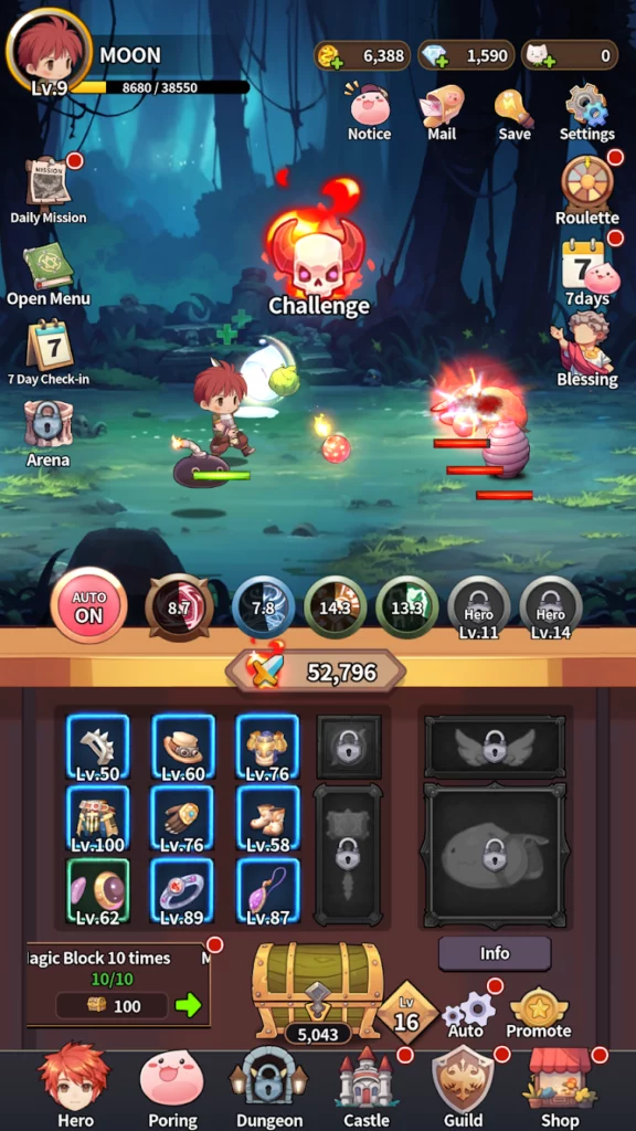 In Poring Rush, players embark on an epic quest in the fantasy world of Rune-Midgard. The game promises simple yet immersive idle gameplay, allowing players to progress even when they’re offline. Players can explore expansive landscapes, delve into mythical dungeons, and engage in battles across the realm, all while customizing their heroes to suit their unique playstyle.