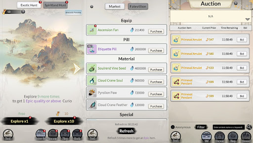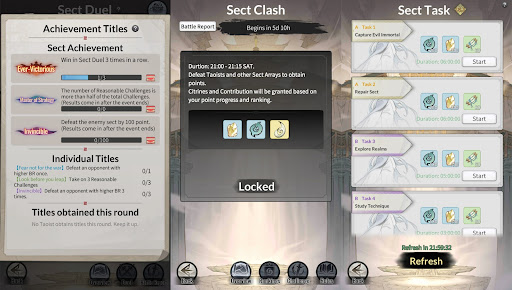 As well as interacting with other members of your sect to build friendships, there are also those who wish to prove their worth through PVP combat. In the Sect Duel, two members of different sects can earn points by engaging in solo PVP duels. The Sect Clash is a group PVP battle in which sect members gather to form an array and defeat other sect Taoists. Members of the sect can obtain resources for the sect and increase their personal stats by completing Sect Tasks, feeding your Sect’s Beast, and constructing buildings.