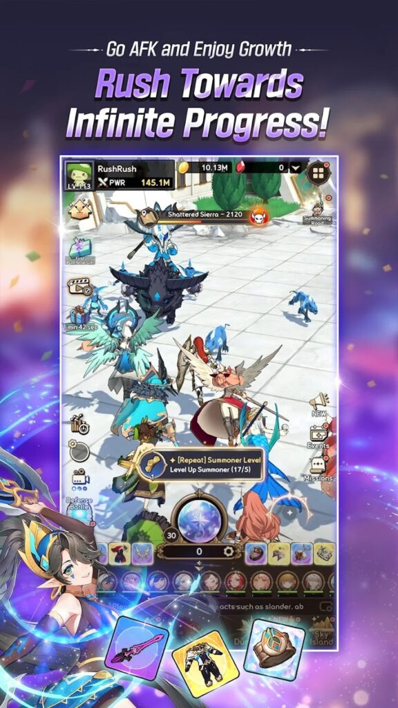 Summoners War: Rush offers thrilling PvP battles, including 10v10 and 25v25 Monster showdowns, allowing players to test their teams against others worldwide. Additionally, players can explore a vast map aboard an airship, conquering zones and earning rewards through strategic battles and area control.