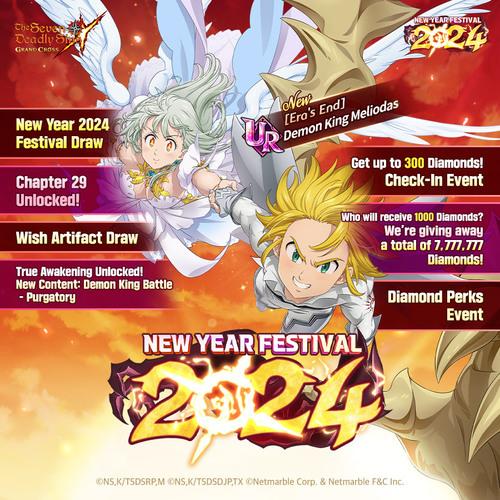 • New Year Festival 2024 Draw: Enter for a chance to obtain the new UR Grade hero [Era’s End] Demon King Meliodas. Festival heroes such as “The Ruler” Tyrant Demon King, [Cursed Shackles] Purgatory Meliodas are included in the line-up. Additionally, players will be given a chance to earn heroes including [Pride of Valhalla] Valkyrie Megellda, [Beach Guardian] Blessing of the Earth Diane at UR 100 Grade. SSR heroes are guaranteed at 300 and 600 mileages while [Era’s End] Demon King Meliodas is guaranteed at 900 mileages.