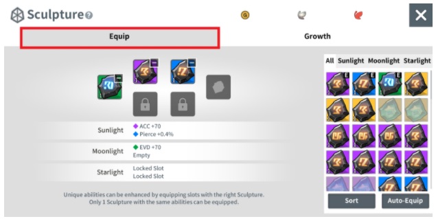 - Sculptures – You can further increase your character’s performance by equipping Sculpture Pieces imbued with special stats. Sculpture Pieces can be separated into Sunlight Piece (Attack), Moonlight Piece (Defense), and Starlight Piece (Support).