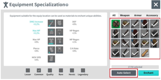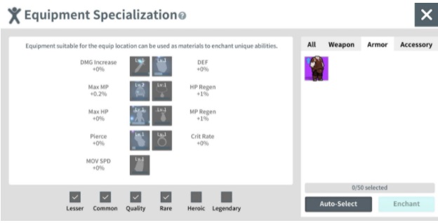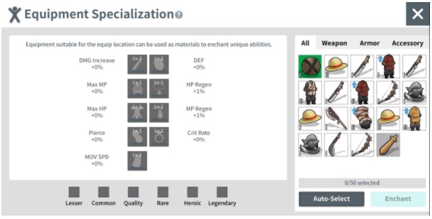 - A different unique ability is enchanted for each location, and the more pieces of high-grade equipment submitted, the greater the degree of enchantment.