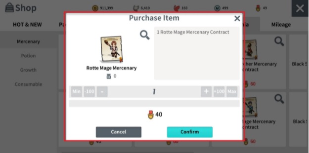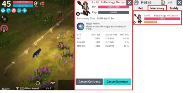 Important note: You cannot contract a mercenary with a level gap of 20 or more. You can contract multiple mercenaries at once, but only 1 mercenary can be summoned at a time.