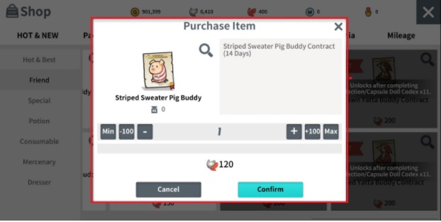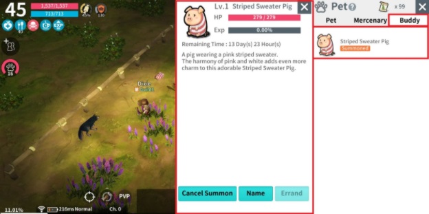 Buddy Contracts can be purchased from the Shop, and they can be tamed by using contracts. Buddies do not participate in battle but can assist you in picking up items. Some Buddies can also grant specific buffs (example: Increases XP gained from defeated enemies).