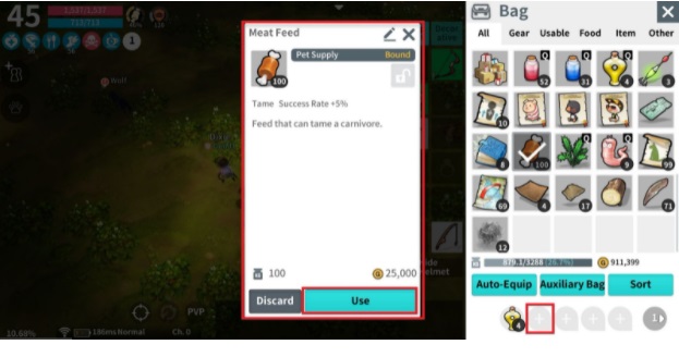 • Use Pet Feed and select the desired monster to tame them as a pet.