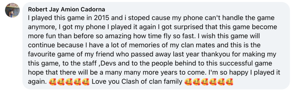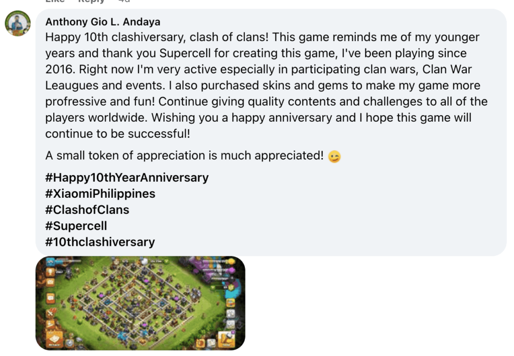 The mobile game’s success with enduring popularity across the world cannot be separated from the players’ love and companionship. During the Clash of Clans’ 10th-anniversary celebration, the game along with Xiaomi Philippines collected players’ wishes on Facebook, recalling many players’ memories of Clash of Clans. Plenty of players have been playing the game for five or six years, even ten years. It is players’ love and companionship that support Clash of Clans to move forward.