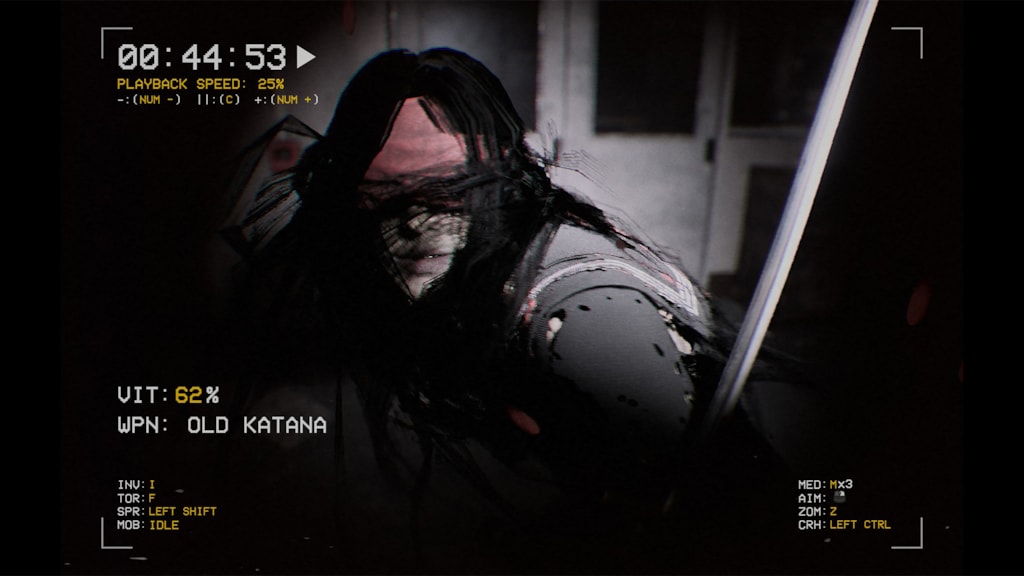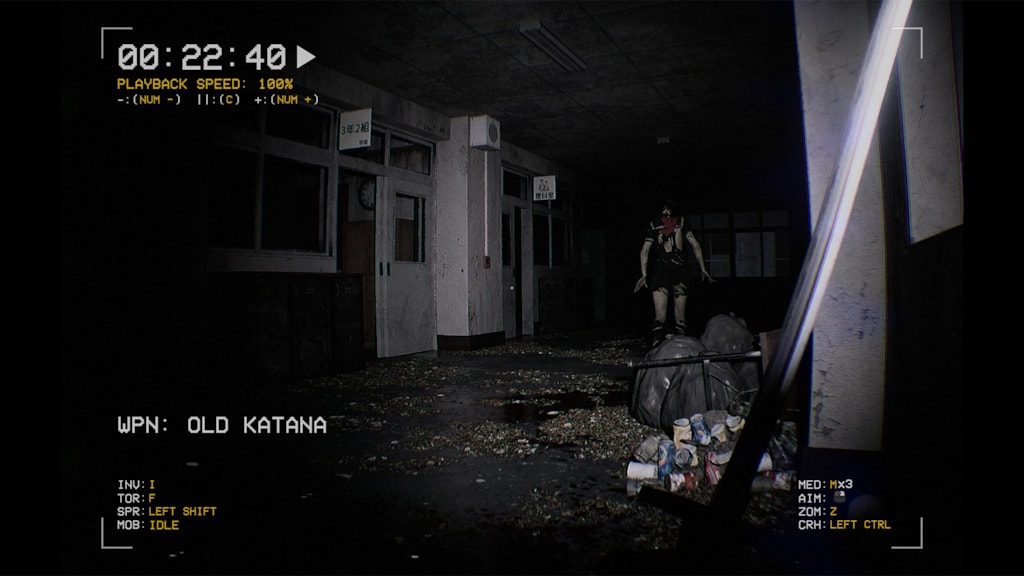 In DEADCAM, players navigate through various self-contained “files,” each offering a unique setting, narrative, and gameplay mechanics. The first file, available at launch, is set in an abandoned Japanese high school and provides approximately one hour of gameplay. Players can wield three weapons: a katana, a pistol, and a shotgun. Combat requires strategic resource management, as aiming slows movement, and melee attacks risk close-quarters vulnerability. Additionally, players must monitor their vitality and manage limited medkits to survive.
