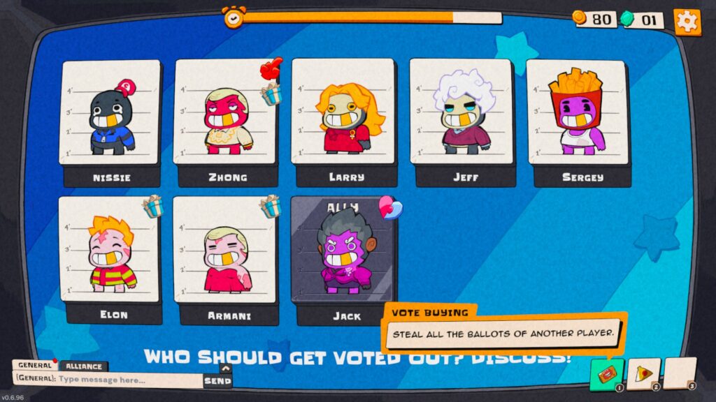 Spend pennies to purchase powerful Advantages to Steal ballots, gain Amnesty, or even avoid being voted out altogether using Scapegoat!