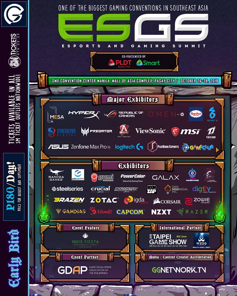 Back for its 5th year, ESGS will once again cater to gaming fans of all levels (beginner, casual, pro, expert, god) with a gaming extravaganza like no other on October 26-28, 2018 at the SMX Convention Center in Mall of Asia Complex, Pasay City.