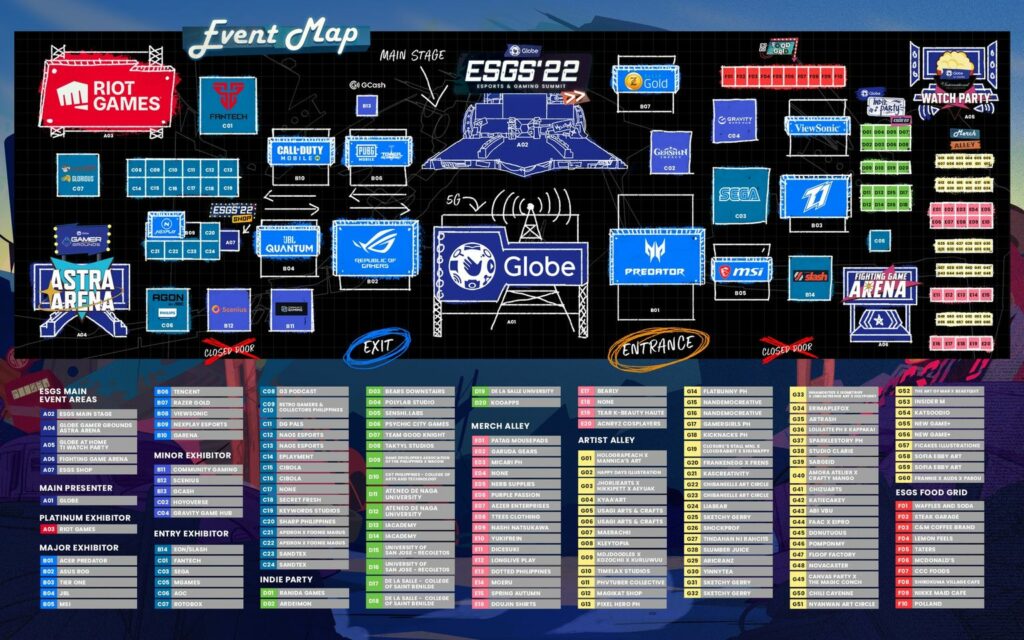 Here is the whole ESGS 2022 venue map. Here you can find all participants for this year’s convention. Every booth has a designation code (A01, A02, and so on). If you’re having trouble finding a specific booth, you can simply refer to the booth code for easier navigation. Is the map image too small? Can’t see the booth names? Here’s the link for the HD map: https://bit.ly/ESGS2022Map