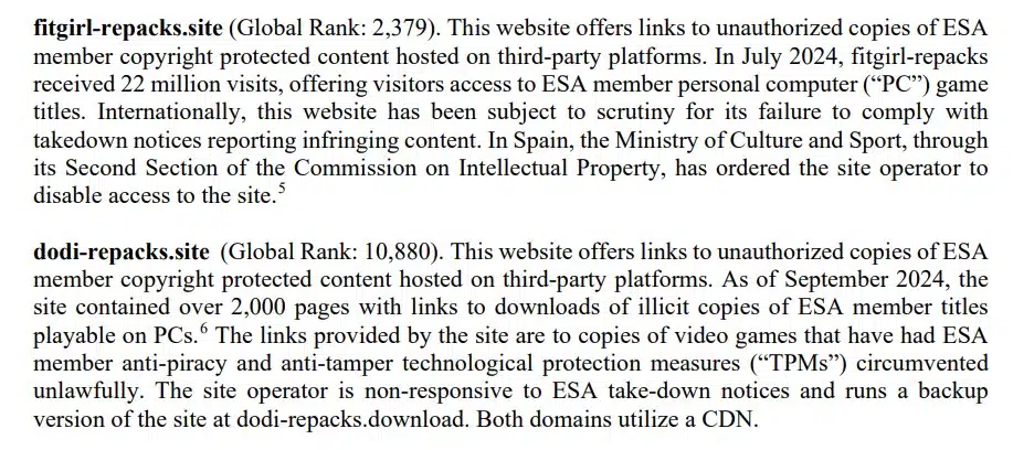 FitGirl-Repacks is widely known for distributing pirated, slimmed-down versions of popular games, which are in high demand due to their ease of distribution. In its July 2024 report, the ESA noted that FitGirl’s website attracted over 22 million visits, linking to pirated PC games from major publishers like Electronic Arts, Microsoft, and Ubisoft.