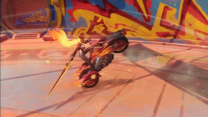 Holding her E will summon her motorcycle. She can then ride her bike and ram enemies and attack at the same time. Her motorcycle will last until all her Night Soul points are consumed. Additionally, while riding her bike, she can use it to climb walls, traverse water, and even fly.