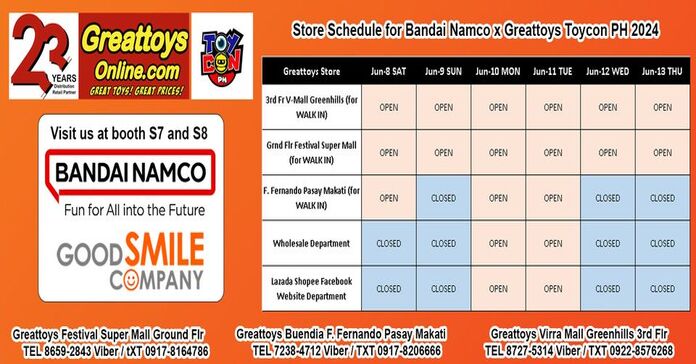Manila, Philippines – The Philippine premier toys and sports superstore GreattoysOnline.com will return for the 2024 edition of The Philippine Toys, Hobbies and Collectible Convention (TOYCON) happening on June 14 to 16, 2024 at the SMX Convention Center, Pasay City as it will be filled with figure displays and products on sale from different brands.