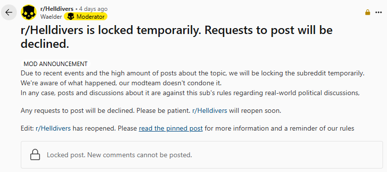 The official Discord was flooded with statements rejecting any link, while moderators on the r/Helldivers subreddit locked the board temporarily after being overwhelmed with off-topic posts.