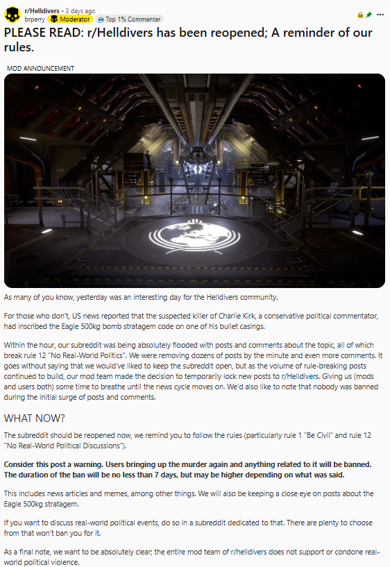 Moderators later explained that within an hour of the news breaking, the subreddit was “absolutely flooded” with posts violating its ban on real-world politics. They clarified that no bans were issued during the initial wave, but new rules now warn that anyone referencing the case in Helldivers 2 discussions faces suspensions of at least seven days.
