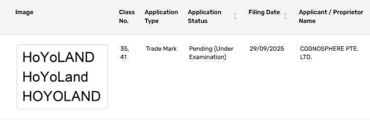 HoYoverse has officially filed a trademark for “HoYoLand” on September 29, 2025, under the name Cognosphere PTE. LTD. The filing is still under examination, and no further details have been shared publicly.