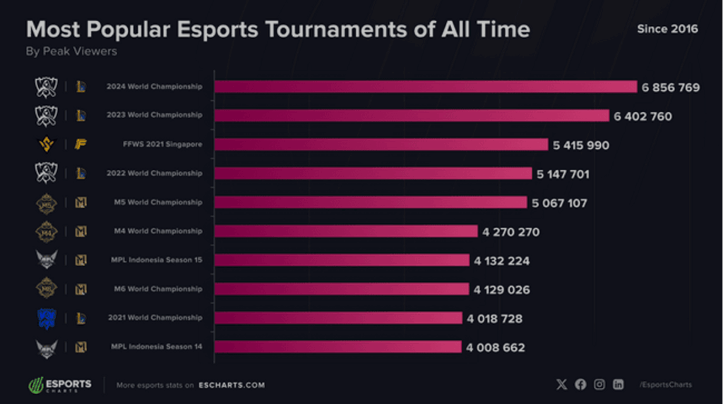 Its ecosystem is one of the largest in gaming, with structured leagues in eight regions that create opportunities for players, teams, and organisers worldwide. Its flagship tournaments, like the M series and Mid Season Cup (MSC), have made the game the most-watched esports events globally. At the Esports World Cup 2025, MSC reached over 3 million peak concurrent viewers and 50 million watch hours, while the M6 World Championship (M6) boasted 4.12 million peak viewers, placing it among the top ten most-watched esports tournaments of all time.