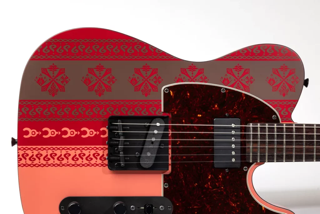 The guitar’s design features distinct elements reflecting the Rathalos, including feather and flame patterns, a tortoiseshell pickguard, black hardware, and the Rathalos guild mark. The monster’s image is also incorporated into the guitar’s body and 12th fret inlay, making it a one-of-a-kind instrument.