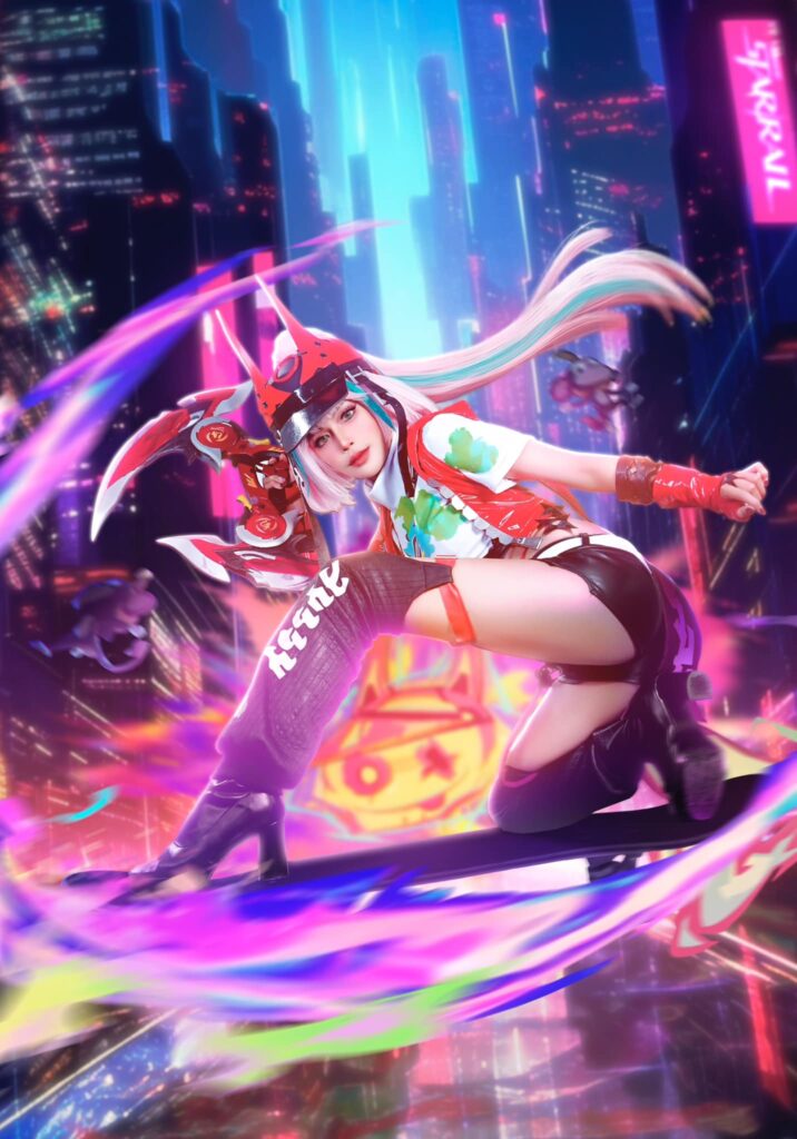 Myrtle’s cosplay stays true to Rappa’s aesthetic, showcasing the character’s vibrant personality and intricate design, with her costume mirroring the character’s ninja-inspired attire. Through her dedicated recreation, Myrtle captures Rappa’s unique blend of stealth and expressiveness, which embodies the “Way of the Ninja” and her broader mission within the game.