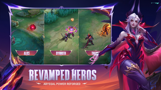 Abyss heroes Alice, Dyrroth, and Thamuz receive revamps and will clash with the Sovereign of the Abyss in their new forms! The Abyss has been reimagined as a perilous realm where resources are scarce and only the strongest endure. Its landscapes are shattered, scorched, and broken—harsh, unforgiving terrains that embody the raw essence of survival. Jagged structures rise like menacing fangs, a constant reminder of the danger that lurks within. These haunting visuals serve as the foundation for the new designs of the Abyss heroes Alice, Dyrroth, and Thamuz.