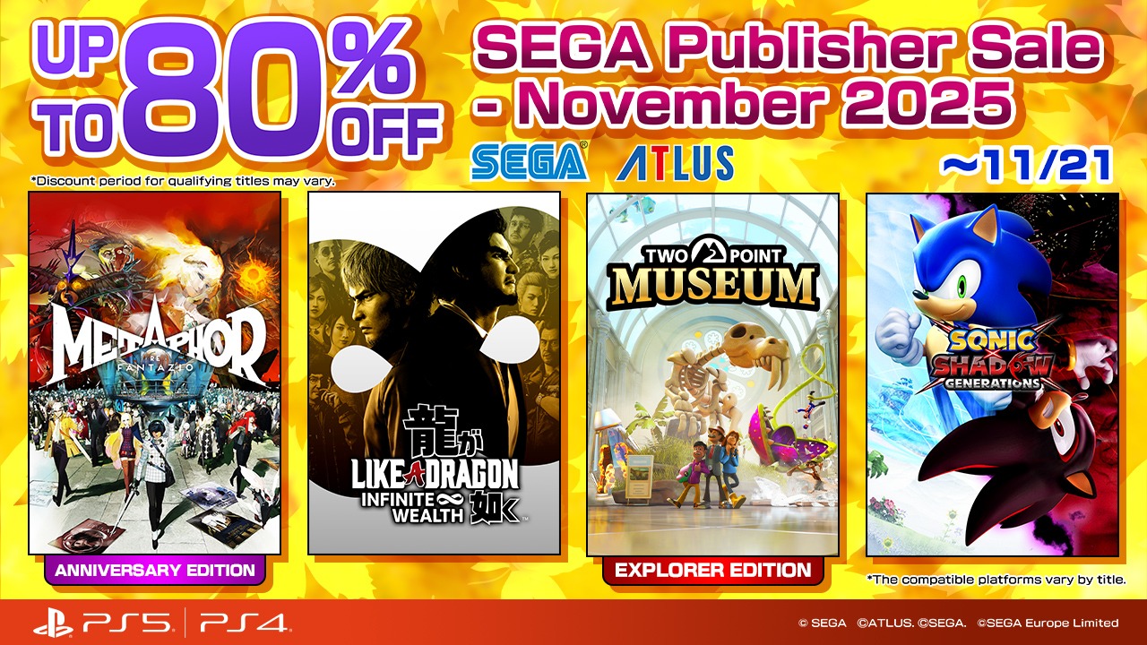 The SEGA Publisher Sale – November 2025 is currently underway on the PlayStation™Store. For a limited time, select PlayStation®4 and PlayStation®5 titles will be available at bargain prices.