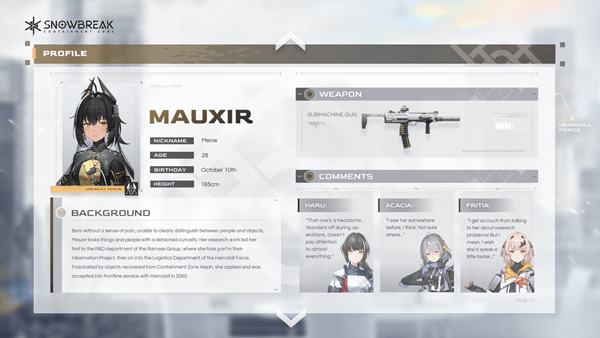 “Snowbreak: Containment Zone”, the Sci-Fi RPG Shooter, has released the character trailer for Mauxir, who uses a submachine gun and has a cute habit of adding “meow” to the end of her sentences. Moreover, the release commemorative event for Mauxir’s character trailer is ongoing on Snowbreak: Containment Zone’s official Twitter account and Facebook Page. Participate in the event to have a chance to win a US$20 Amazon Gift Card.