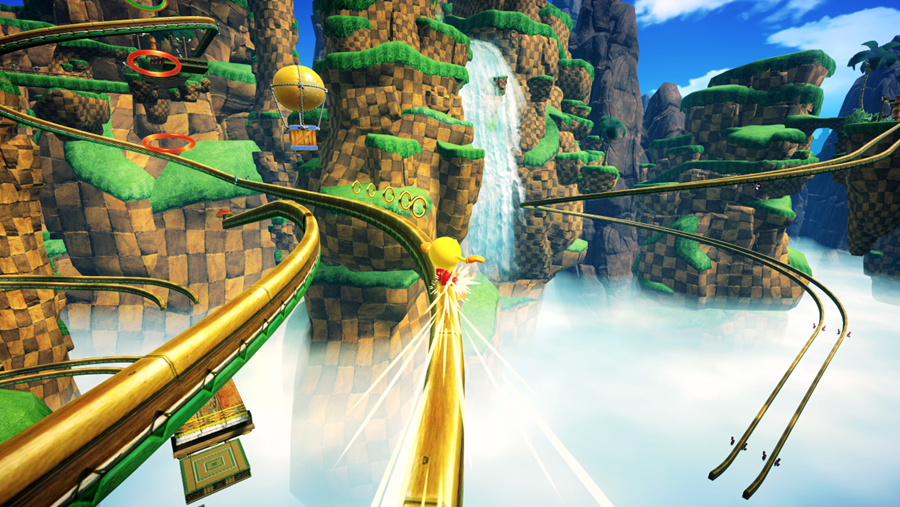 The stage will feature a tropical landscape with blue skies, white clouds, palm trees and totem poles. The checkerboard-patterned ground and cliffs have been reimagined, capturing the essence of Green Hill, packed with familiar Sonic the Hedgehog gimmicks, including 360-degree loop-de-loop, springs and dash rings. Enemies like Moto Bug and Buzz Bomber will also appear when racing through the stage at high speed, while collecting golden rings!