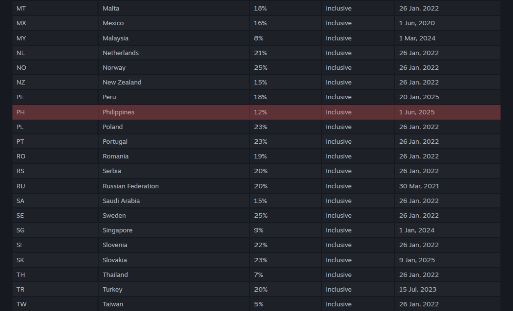 Starting June 1, 2025, Steam officially implemented a 12% value-added tax (VAT) on all digital purchases made in the Philippines, including games, DLCs, and in-game content. This change aligns with the recent passage of Republic Act 12023, also known as the VAT on Digital Services Law. It marks a significant shift in how digital goods are taxed locally.