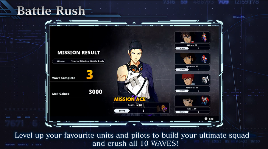 Crush the wave-based battle system and prove your strength. Take down your opponent in a single turn to claim victory! Level up your favourite units and pilots to build your ultimate squad – and crush all 10 WAVES!