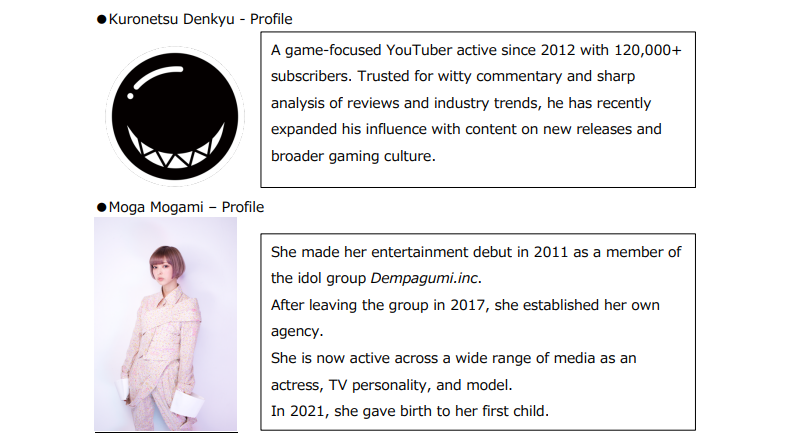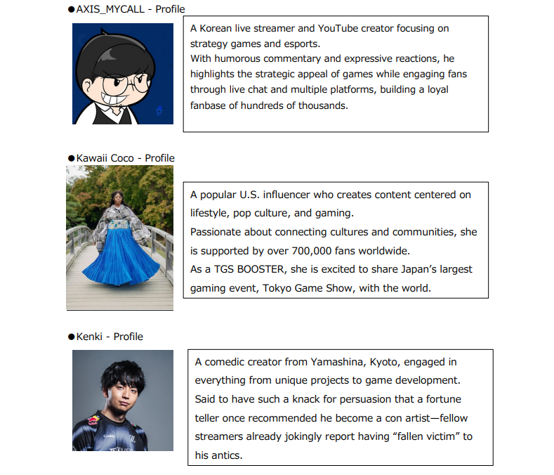 At TGS2025, official influencers called TGS BOOSTERZ will be appointed under the theme of “boosting Tokyo Game Showʼs appeal to the world.” Today, the second wave of influencers has been announced: AXIS_MYCALL, Kawaii Coco, Kenki, Kuronetsu Denkyu, and Moga Mogami (in alphabetical order).