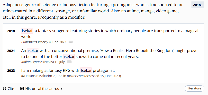 While “isekai” in Japanese literally means “another world,” the OED defines it specifically as a genre of Japanese science or fantasy fiction. In this genre, a protagonist is transported to or reincarnated in a strange or unfamiliar world. The dictionary even cites anime, manga, and video games as examples of media where the term applies.