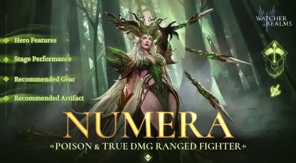 The new hero is a fighter from the Star Piercers faction. As a hero from the Star Piercers faction, Numera has a long attack range which can cause her to do ranged damage to enemies easily. Most heroes from the Star Piercers faction can deal lots of damage, and Numera is no exception. She has a unique ability and skills to poison heroes and deal true damage with her poison. She should be a good addition to commanders who need fighters with high damage, and she is also one of the core heroes in poison team.