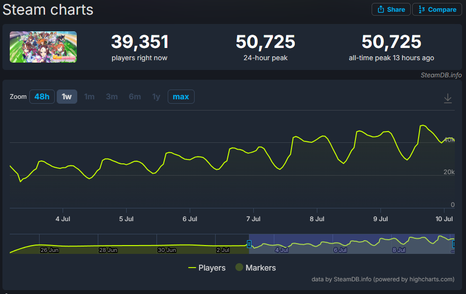 According to data from SteamDB, Umamusume started strong with 25,505 concurrent players on release day. But what’s even more surprising is its continued growth. By July 8, that number had nearly doubled, peaking at 47,264 concurrent players. Most gacha games struggle to maintain momentum after launch. Umamusume, however, is defying that trend.