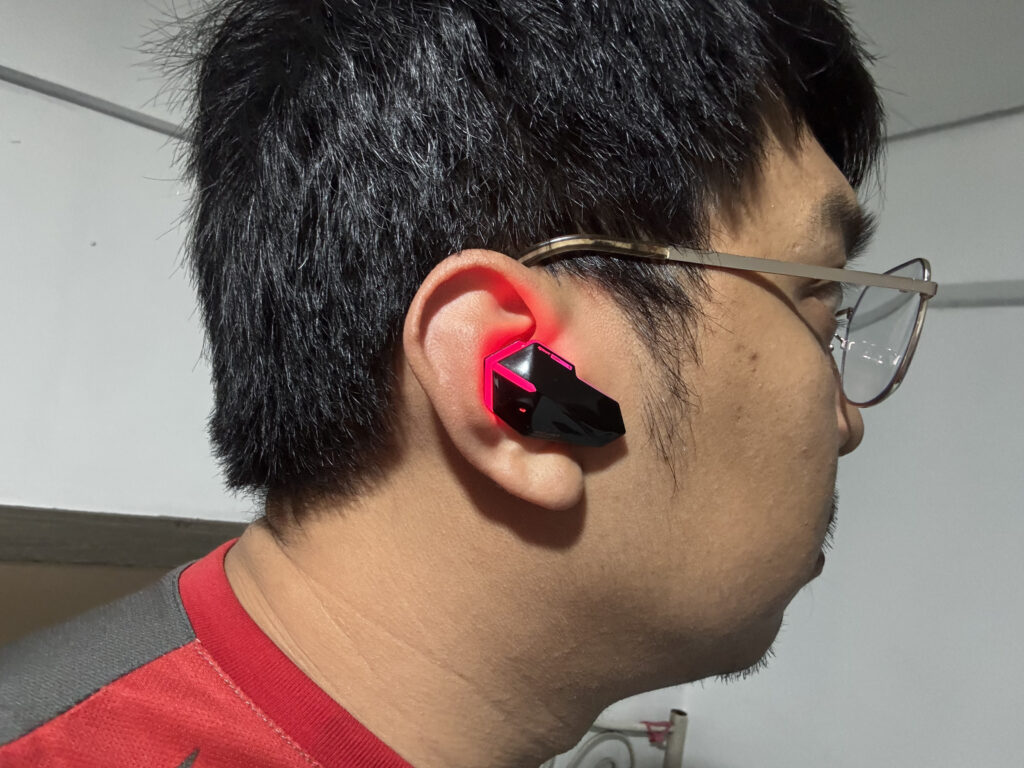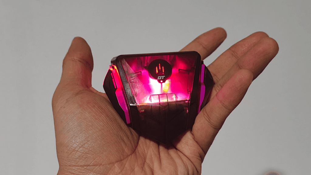 Starting with the design, the charging case uses a transparent shell that shows off the internals and lighting effects. While transparent plastic can sometimes feel cheap, this mostly comes down to preference. The see-through design clearly aligns with SAN Sound’s futuristic and gaming-focused aesthetic.